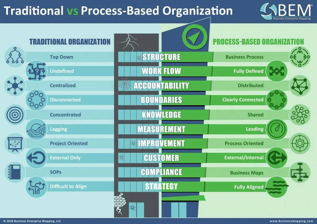 Because we make our living implementing process-based management systems that improve organization outcomes, we are often asked to compare Business Process Management (BPM) with more traditional - vertical and hierarchical – organization structures. What follows is a comparison between Traditional Management vs Business Process Management within ten key organizational characteristics.