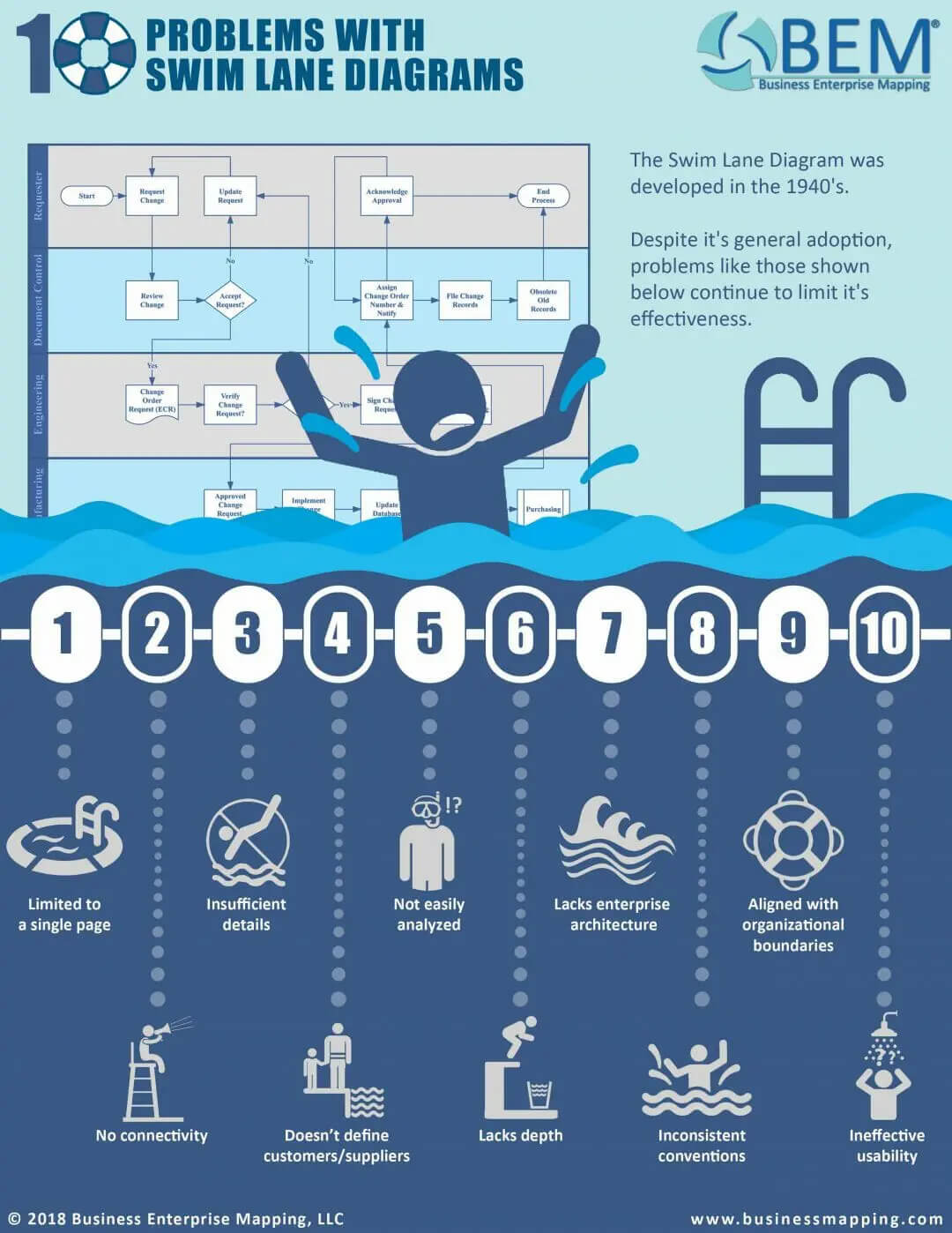 The Swim Lanes Diagram has existed for over half a century without much evidence of continuous improvement. While it is still the generally accepted standard for process flow documentation, we believe the shortcomings identified above make it extremely difficult for the Swim Lane Diagram to be utilized effectively. It is long overdue for retirement and should be replaced with a better approach that meets the needs of modern business structures.