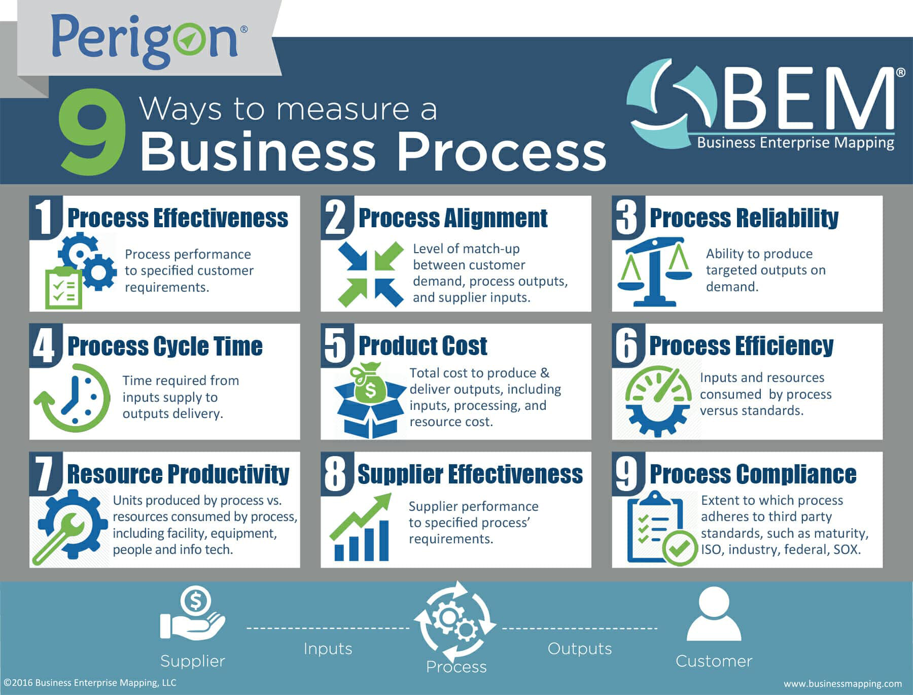 When measuring the performance of work, begin by first thinking about the fundamental Supplier-Input-Process-Output-Customer (SIPOC) business process model. It logically follows there are a limited number of process characteristics that can be measured and the choice of those measures should be driven by the business process purpose within the overall business system and enterprise need. This same group of measures applies no matter what the process type, whether it is manufacturing, administrative, physical or intellectual. In these different businesses, process priorities are likely different, which informs the best measures to be selected (from the larger measurement pool) for driving process performance improvement.
