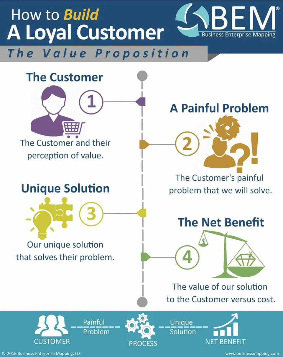 An organization is defined by the customer value proposition it provides to end customers and the work that delivers that value proposition. Work flows in the organization through a series of business processes that align to satisfy customers. To even exist, every process within the organization should have a purpose that supports the overall value proposition. Generally stated, the purpose of a process is to delight a loyal customer (ethically of course) using minimal resources. And the value proposition of the process is what fulfills the core purpose. Therefore, every process your organization has a value proposition and it should clearly communicate the following information.