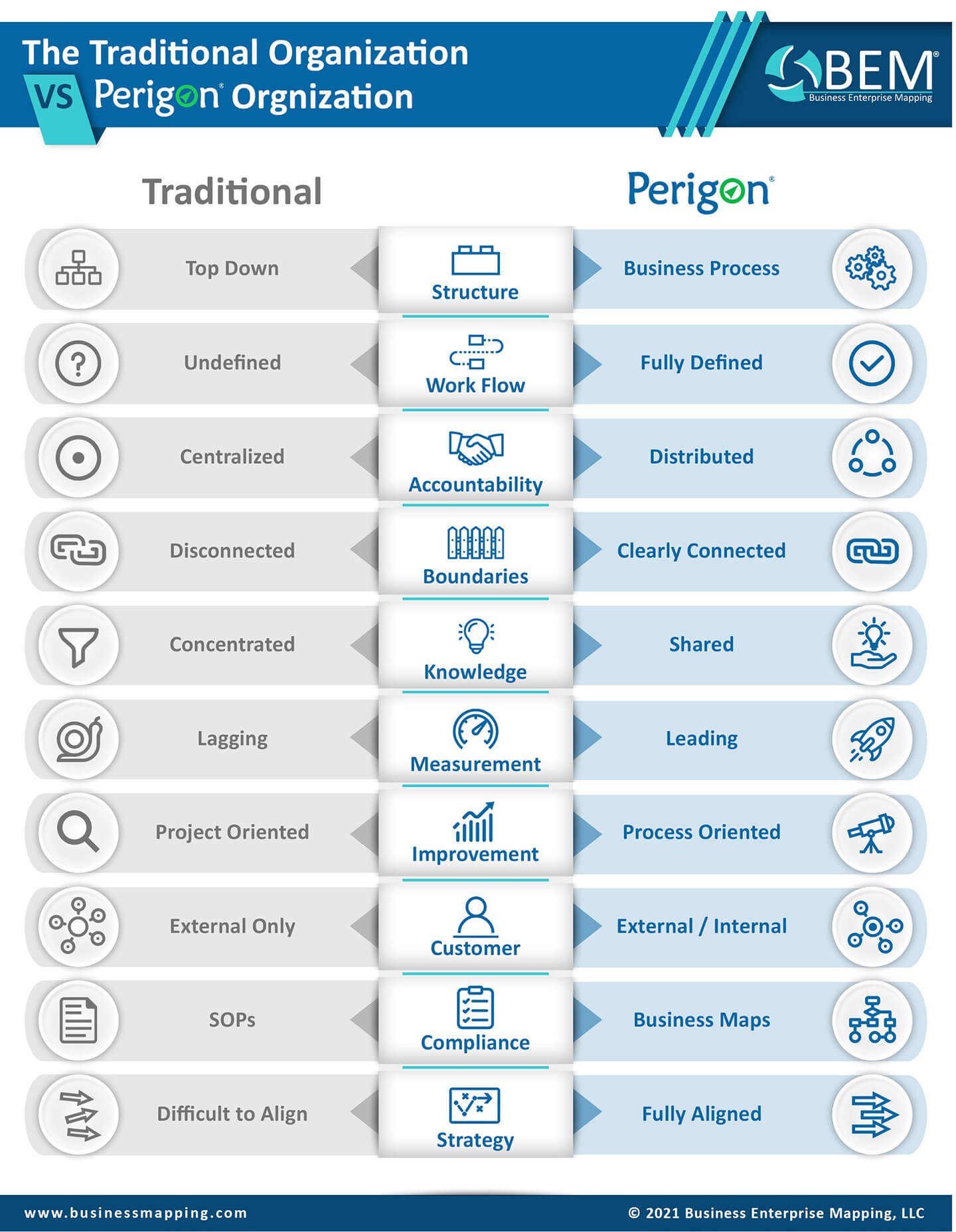 We have been implementing process management and improvement for twenty-five years and we still find that many new clients do not have mature process management capabilities. Internal improvement efforts are often focused on solving immediate problems and fighting fires while missing the opportunity to build a core process foundation that delivers the capability to run the business better. Summarized below are ten characteristics of a process management system that we believe is necessary to successfully transform an organization from a traditional top-down management structure into a successful process management and improvement enterprise.